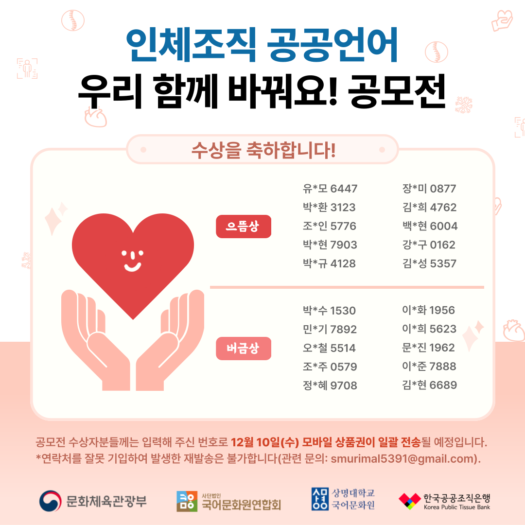 | [°ø¸ðÀü °á°ú¹ßÇ¥] 2025 ÀÎüÁ¶Á÷ °ø°ø¾ð¾î ¿ì¸® ÇÔ²² ¹Ù²ã¿ä! ¼ö»óÀÚ ¹ßÇ¥ | |||