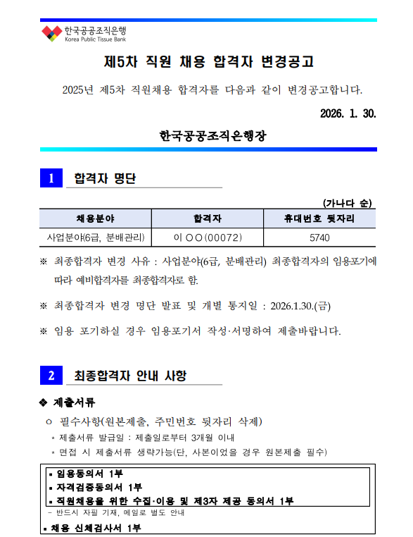 | [ä¿ë] Çѱ¹°ø°øÁ¶Á÷ÀºÇà 2025³â Á¦5Â÷ Á÷¿ø ä¿ë ÇÕ°ÝÀÚ º¯°æ °ø°í | |||